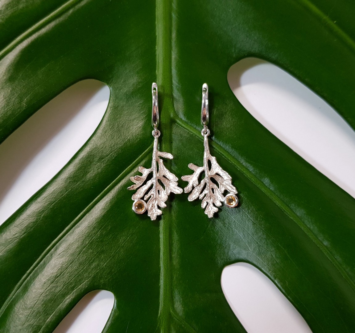 Gaivų pavasarį primenantys sidabro auskarai su natūraliais citrinais.