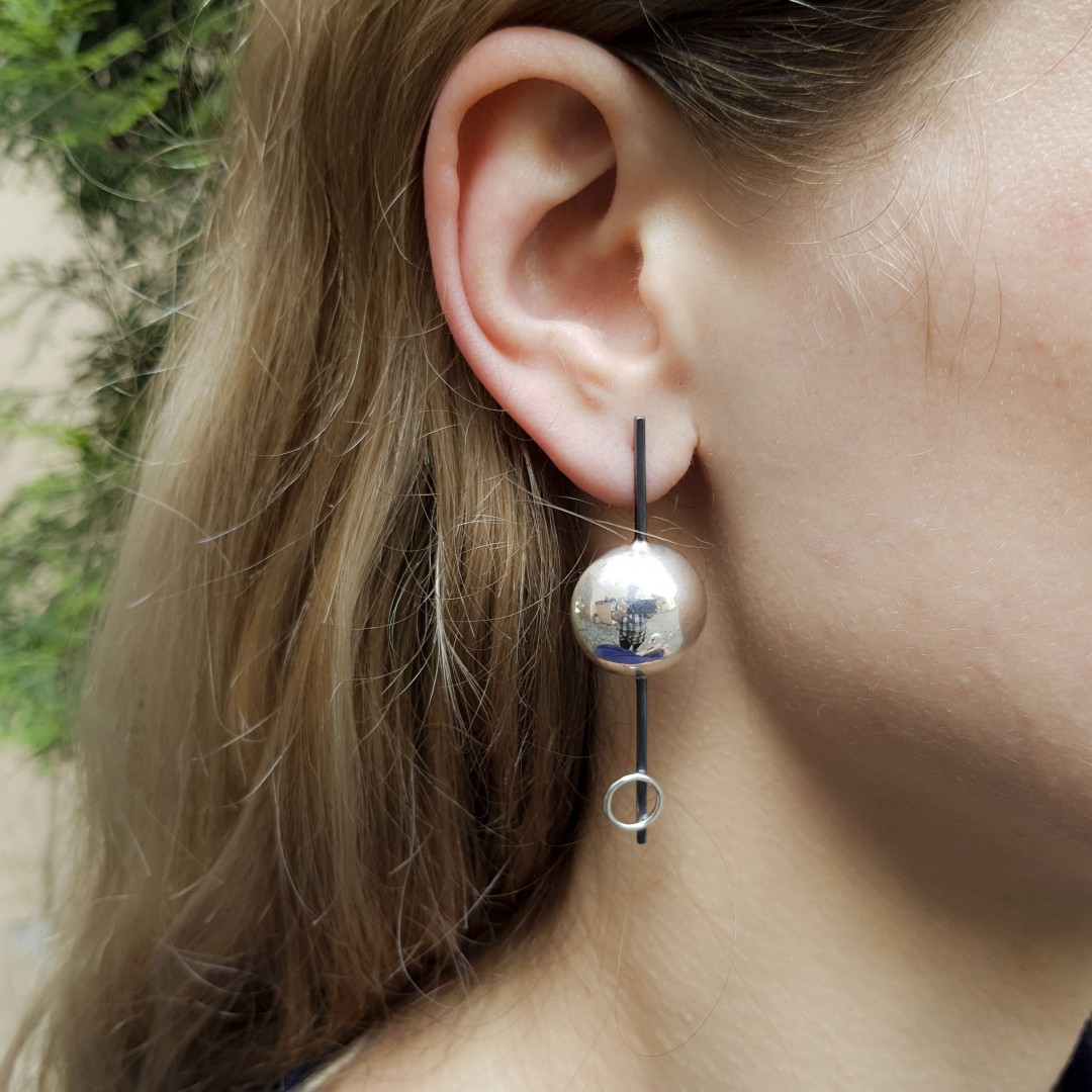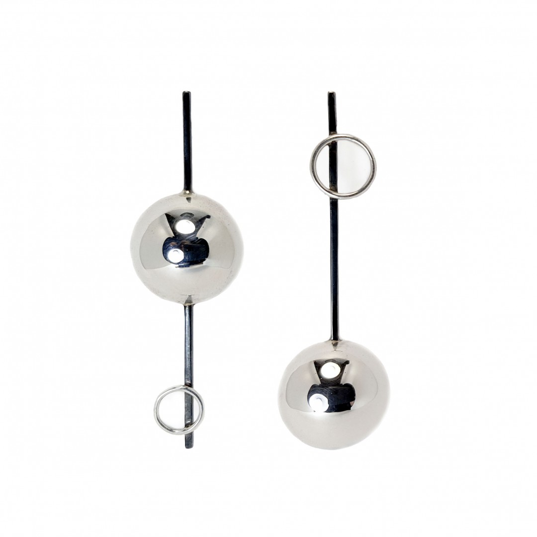Modernaus dizaino ilgi sidabriniai auskarai.