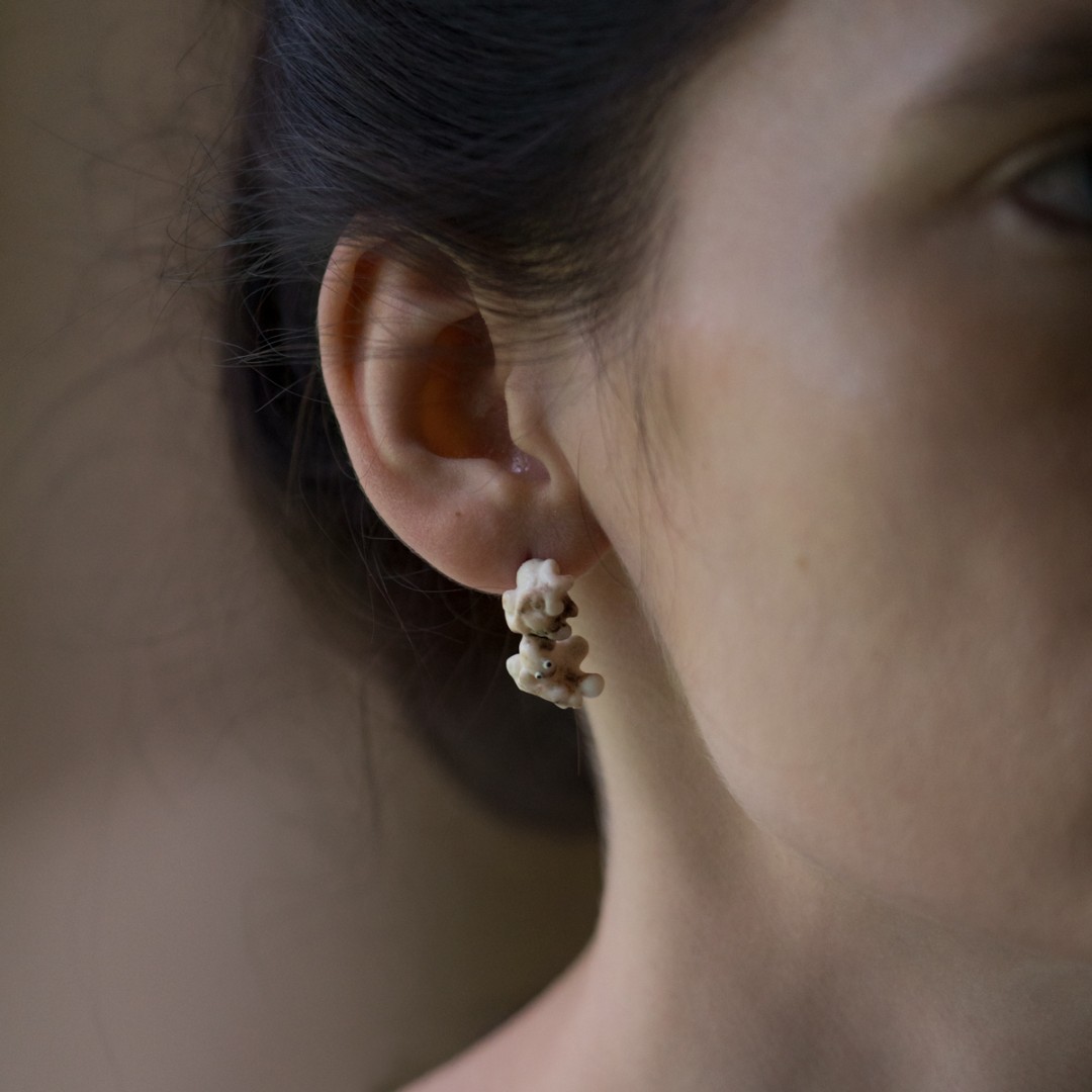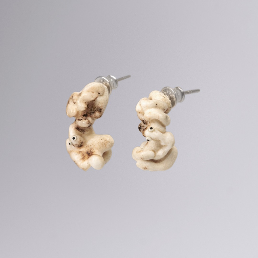 Vienetiniai rankų darbo auskarai sukurti iš elnio rago. Elnio ragas natūraliai banguoja prie pat gyvūno galvos (vadinamoji rožė), šis bangavimas dar sustiprintas juvelyriniais įrankiais. Iš rago vagelių išnyra mažyčiai sutvėrimai mamuto kaulu ir juodmedžiu inkrustuotomis akytėmis. Lengvi, patogūs, kasdieniniai auskarai su šmaikščia detale.
