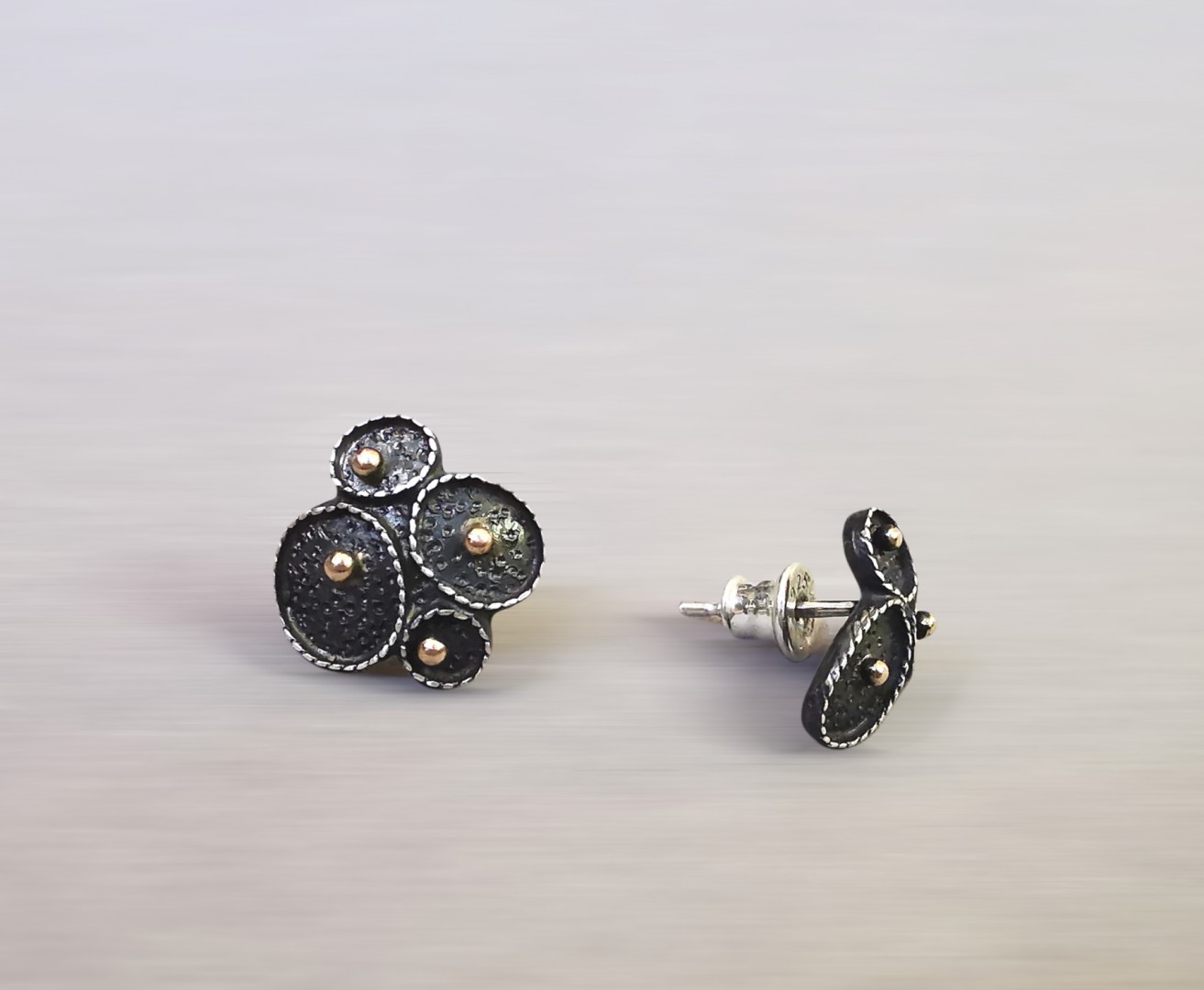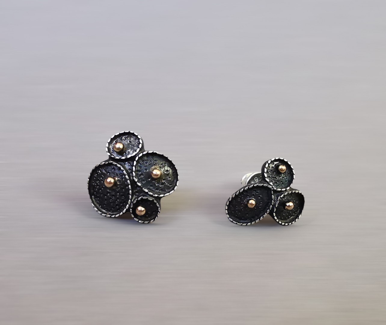 Asimetriški, oksiduoti ir papuošti auksinėmis granulėmis. Šie auskarai visada primins jūrą ir nugludintus, ant kranto išmestus akmenėlius.