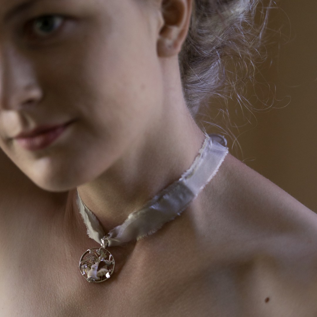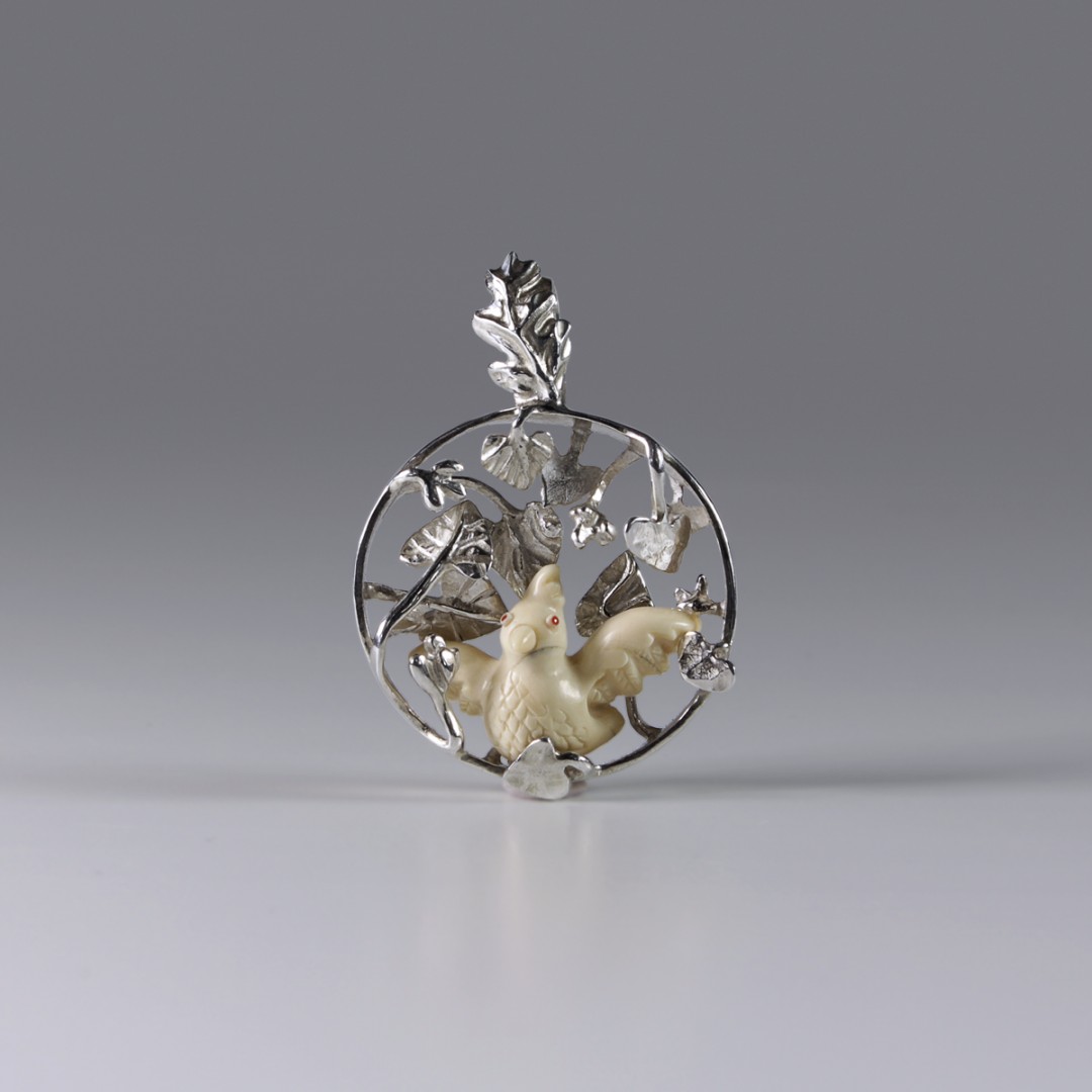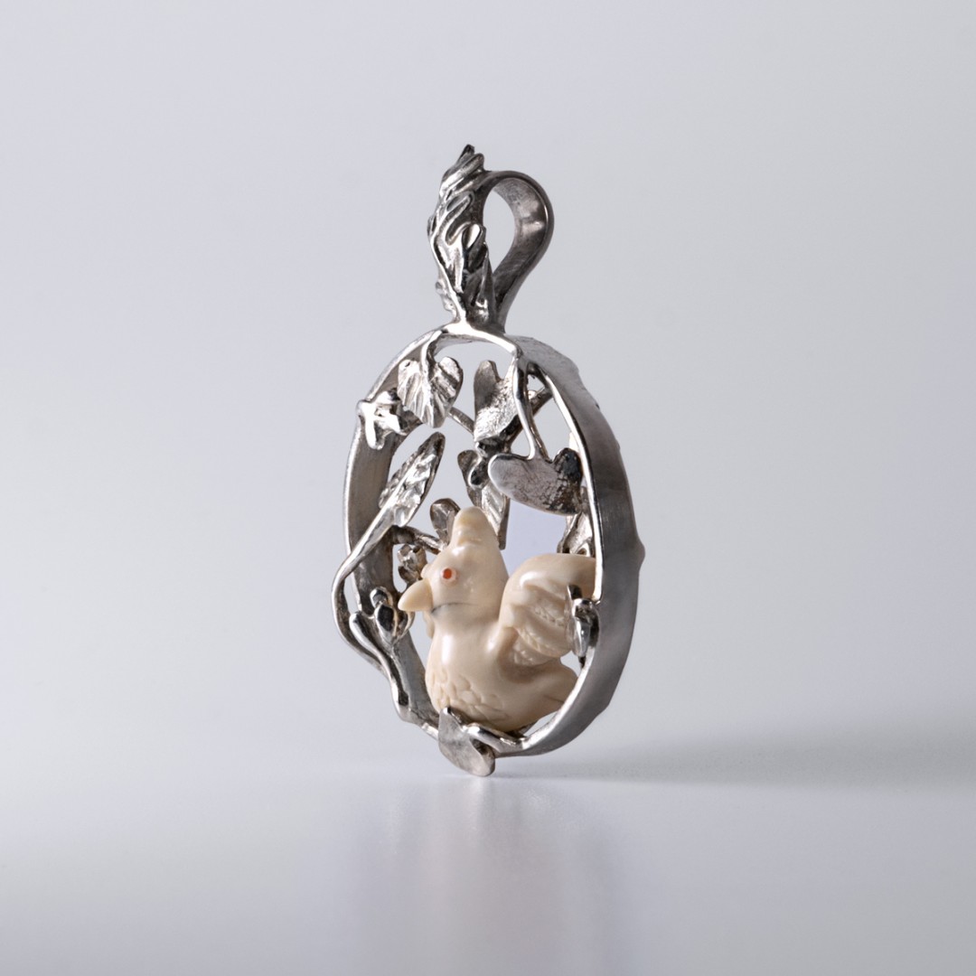 Vienetinis rankų darbo kaklo papuošalas su mamuto kaulo papūgėle. Apsupta sidabro lapijos ji laukia savo papūgiuko. Paukštelės akyse liepsnoja raudonojo koralo inkrustacijos. Šis romantiškas kaklo papuošalas dailiai atrodys nešiojamas prie pat kaklo, pakabintas ant šilko kaspino. Originalus užsegimas leidžia lengvai keisti kaspinus ir kaskart atrodyti kiek kitaip.