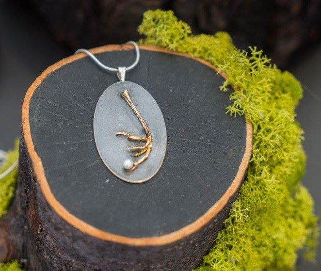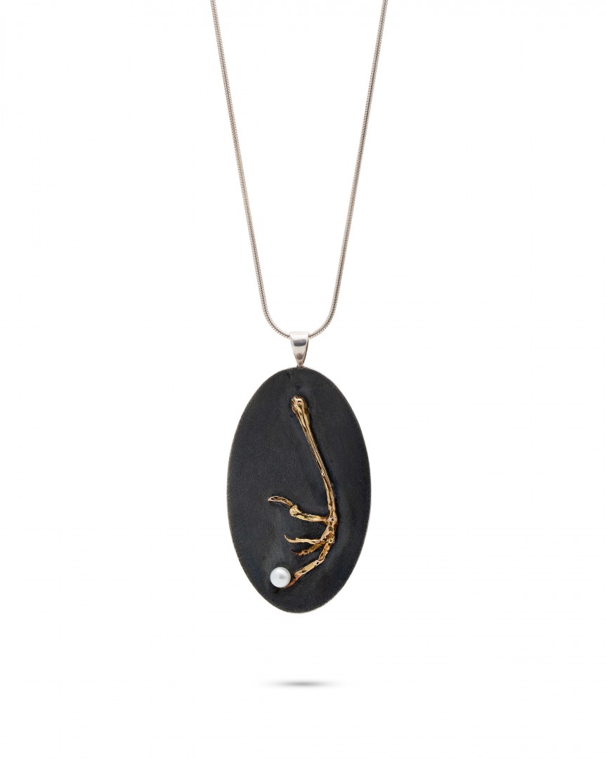 Pakabukas, talpinantis savy daug simbolinių sluoksnių. Lyg šamaniškas amuletas, dovanosiantis atvaizduojamo žvėries jėgą ir išmintį. Šiuolaikiška, švari forma, kuriai nejaukumo, bet kartu ir mistinės traukos, suteikia auksinė paukštuko koja, o visą kompoziciją subtiliai išbaigia baltas perlas – tyrumo ir tobulumo simbolis. Kitoje pakabuko pusėje yra graviruotas autorės piešinys – augalijos gyvybingumas. Visa, kas miršta, vėl prisikelia kitokiam gyvenimui.