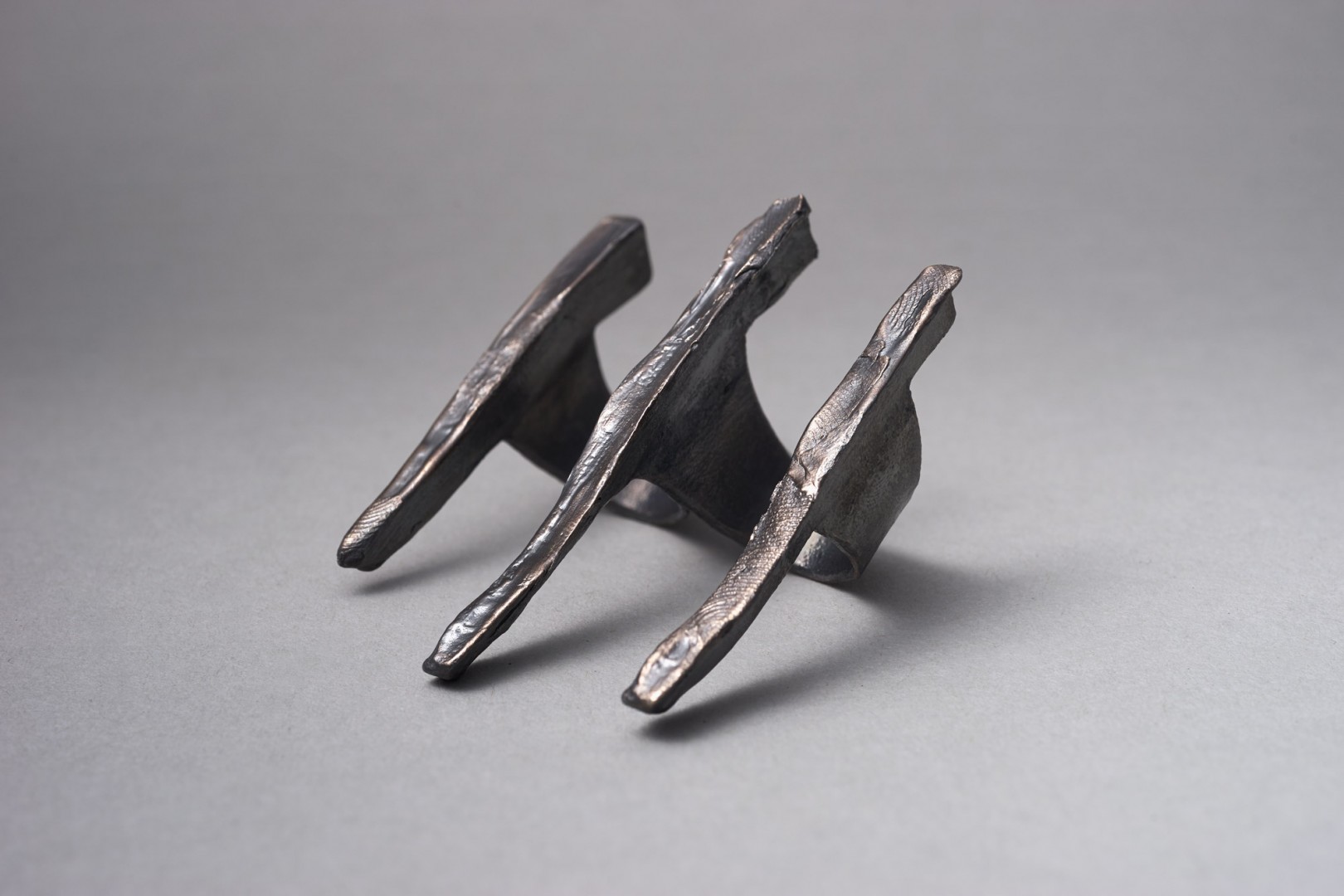Faktūruoto matinio ir oksiduoto sidabro žiedas dviems pirštams.