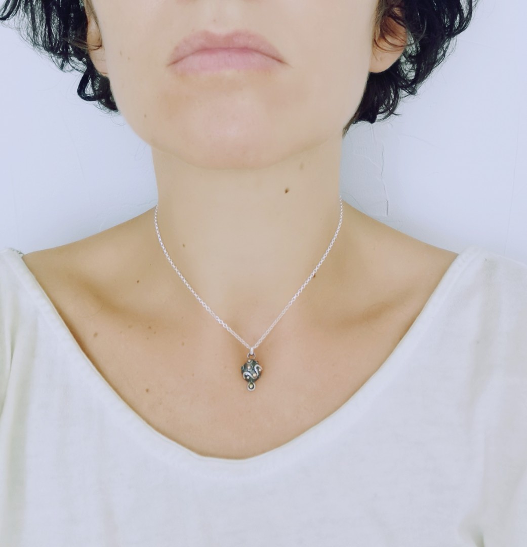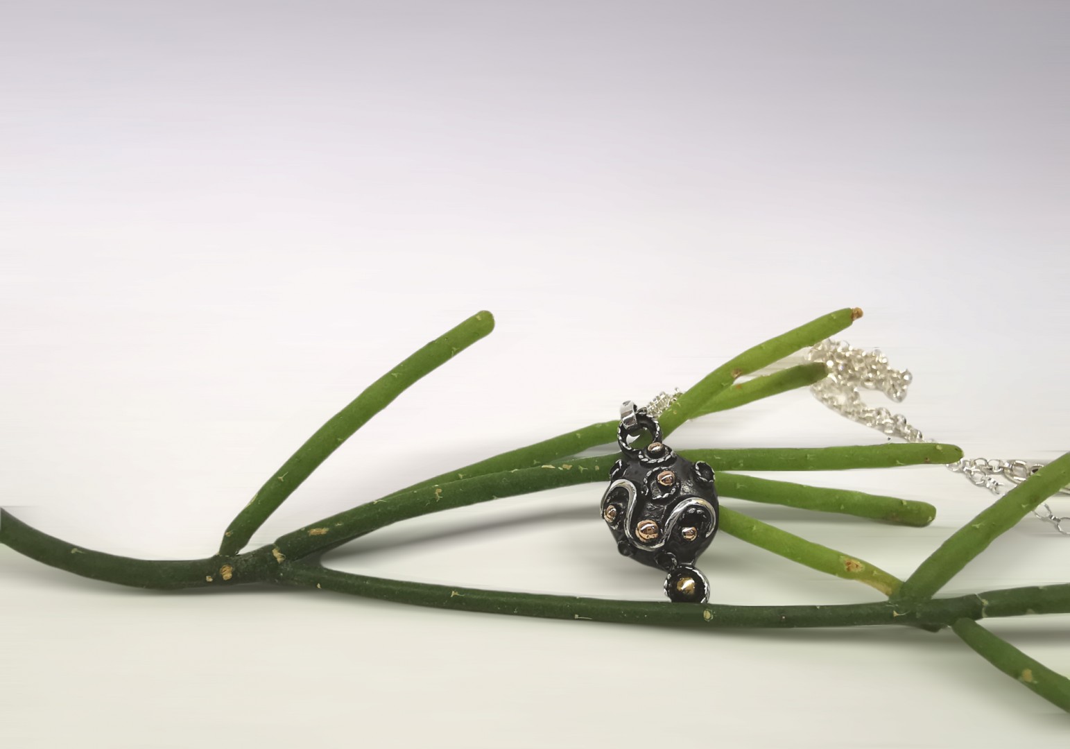 Juodinto sidabro pakabukas, puoštas aukso granulėmis.