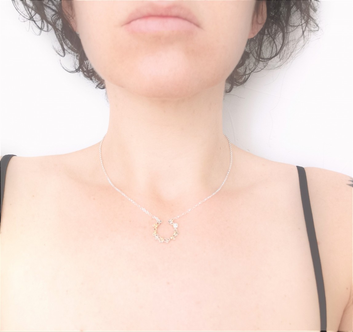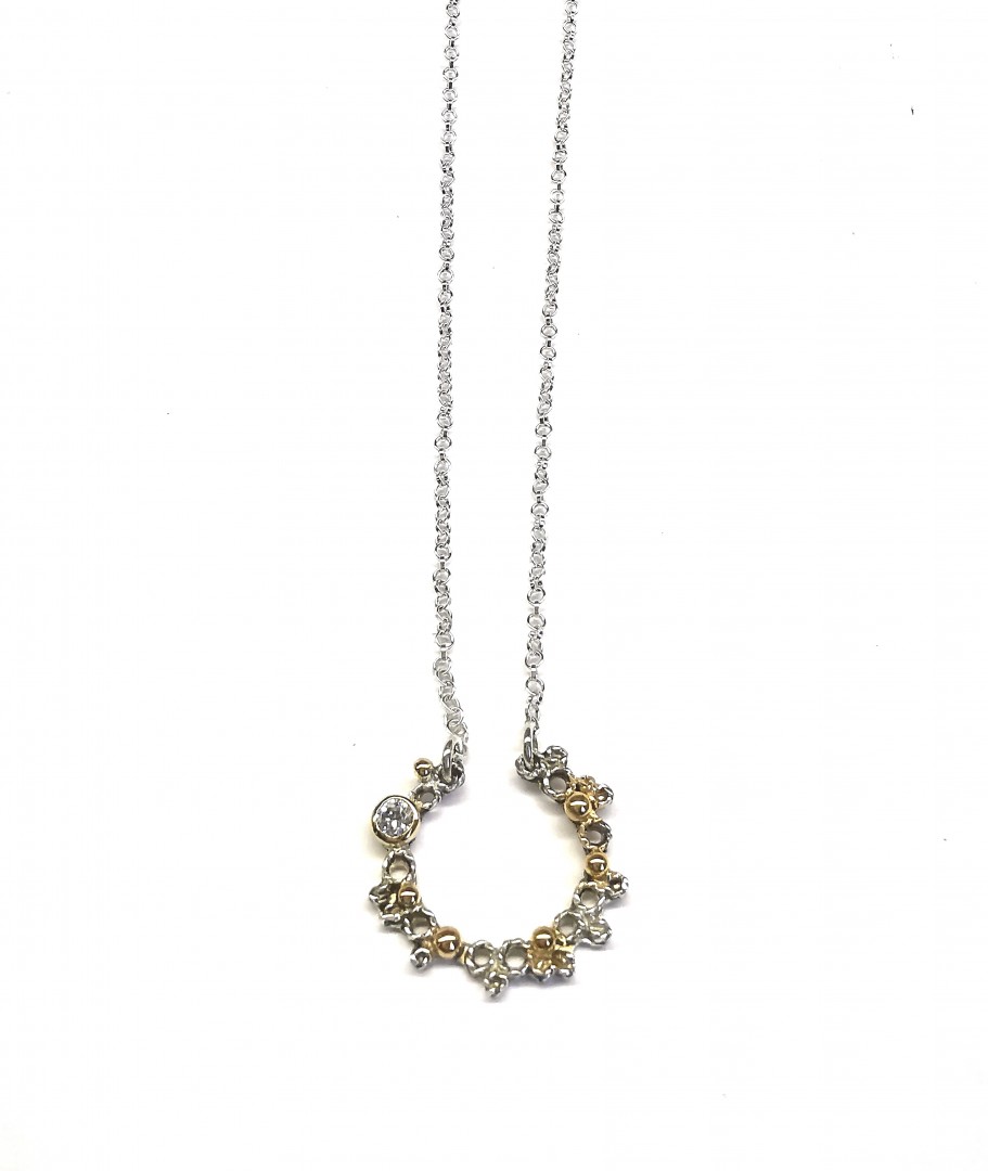 Subtilus sidabrinis pakabukas, puoštas paauksuotomis detalėmis ir cubic cirkoniu.