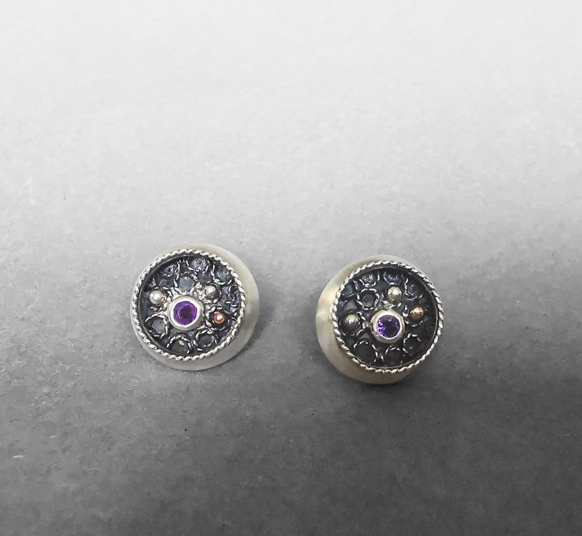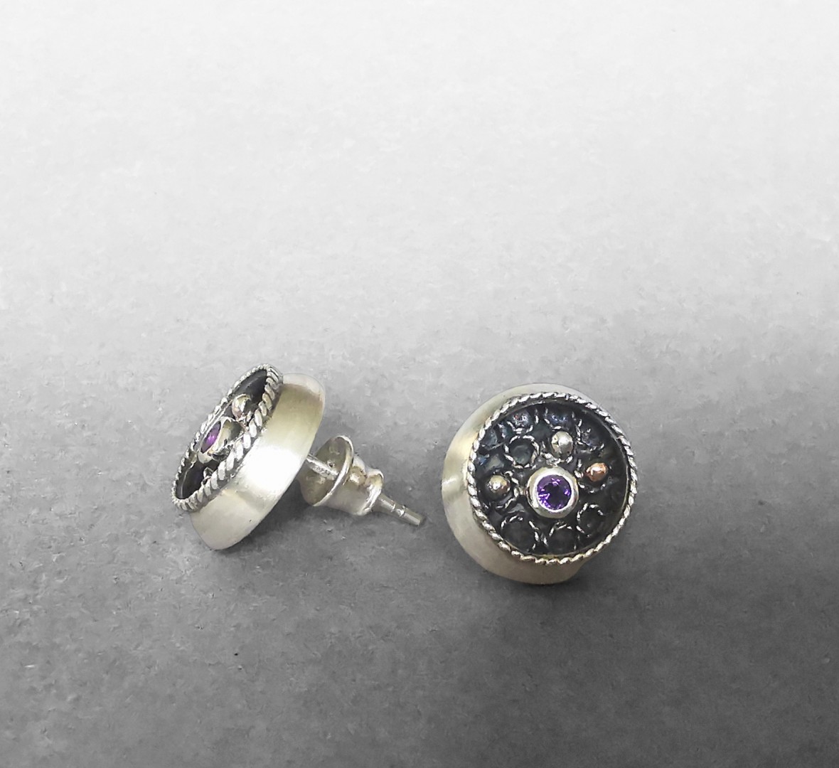 Subtilūs ir žaismingi auskarai, puošti ametistais.