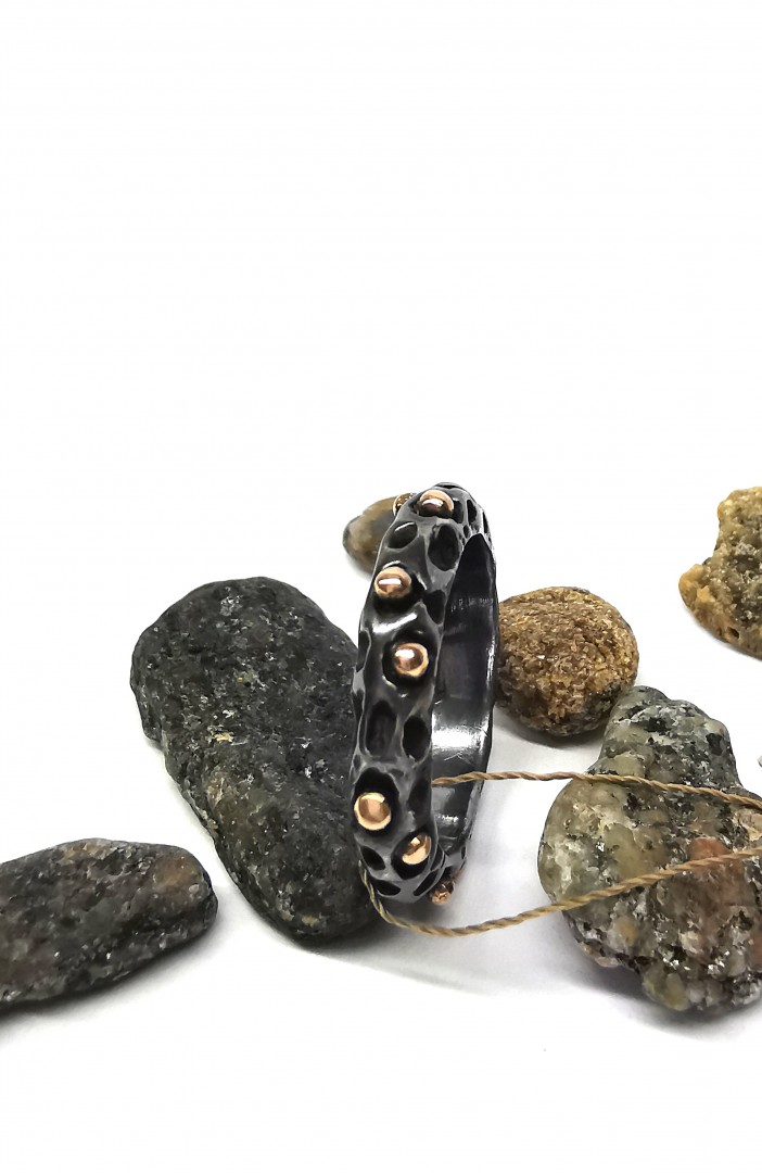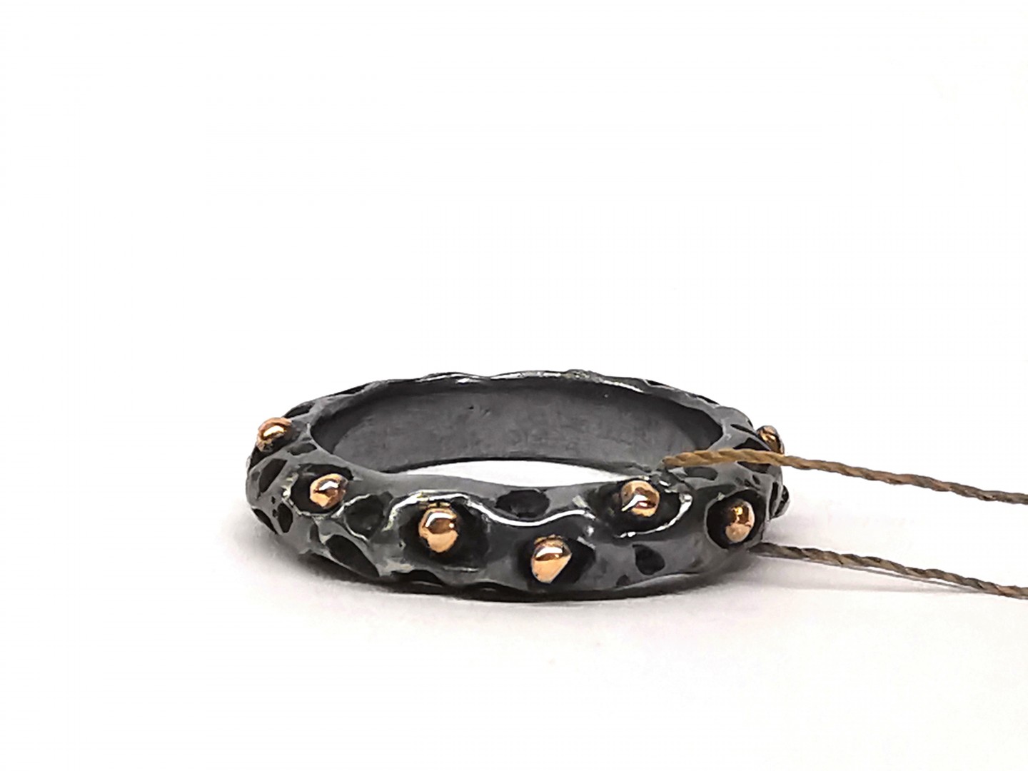 Oksiduoto sidabro žiedas, puoštas auksiniais burbulais