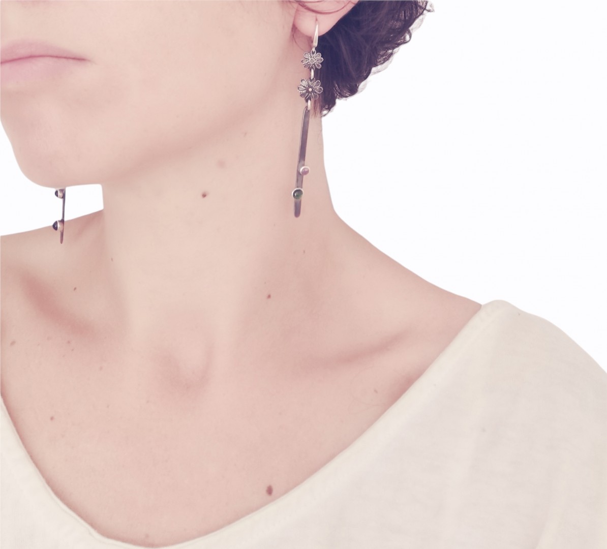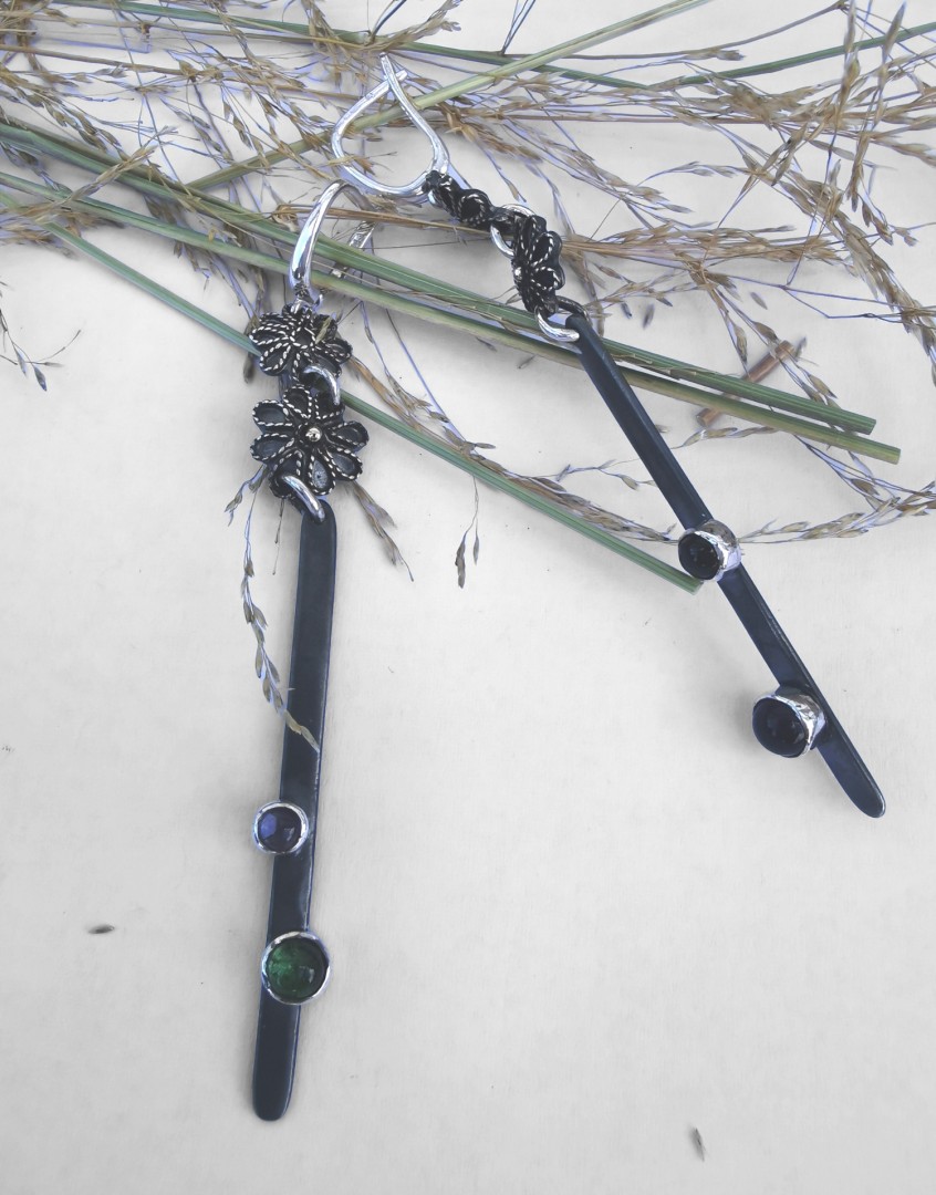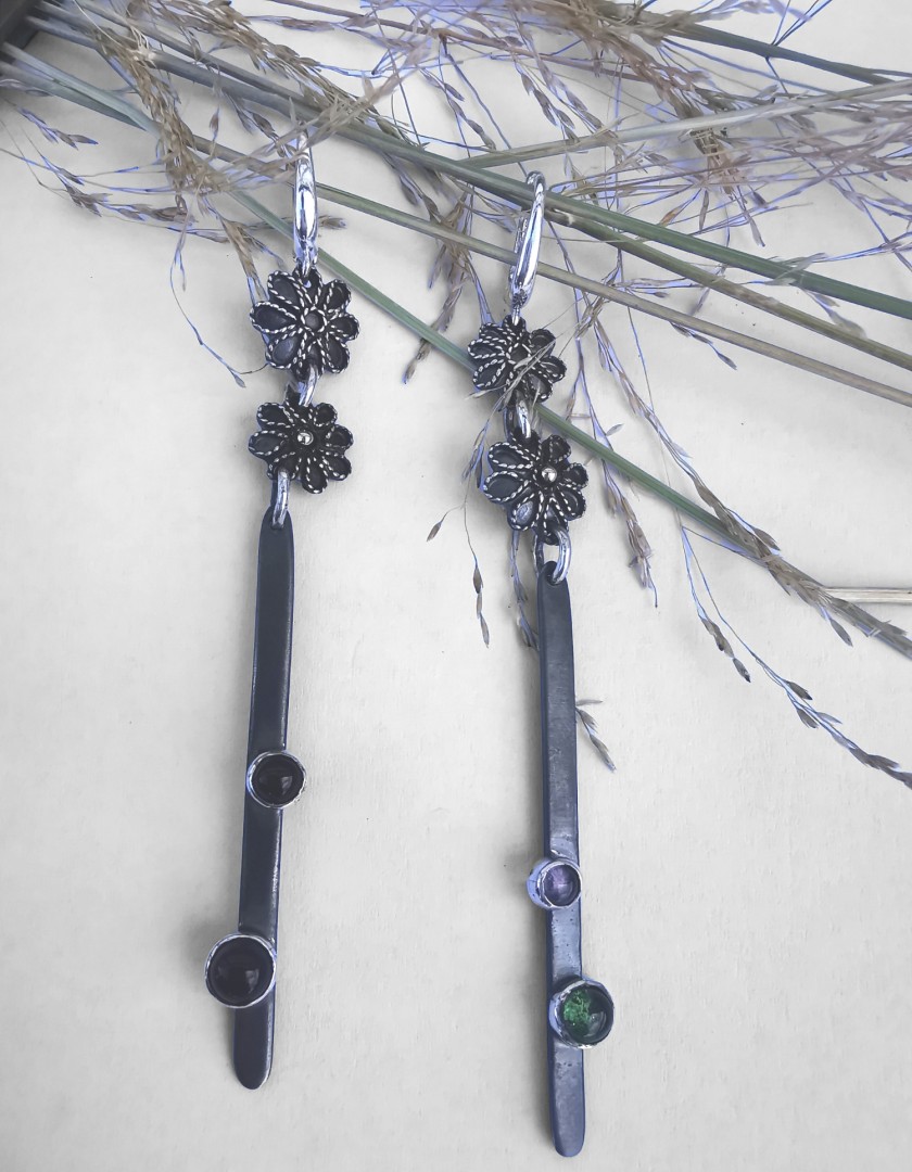 Efektingi, juodinto sidabro auskarai, puošti turmalinais vei aukso granulėmis.