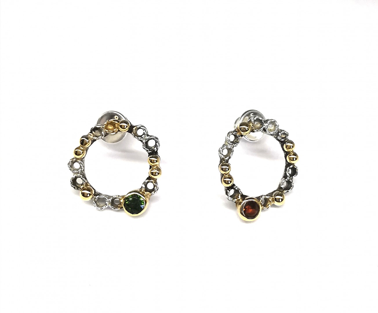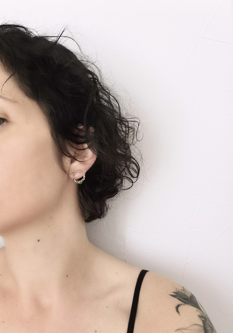 Nedideli ir žaismingi, paauksuoto sidabro auskarai, puošti foninio filigrano detalėmis, citrinu bei chromdiopsidu.