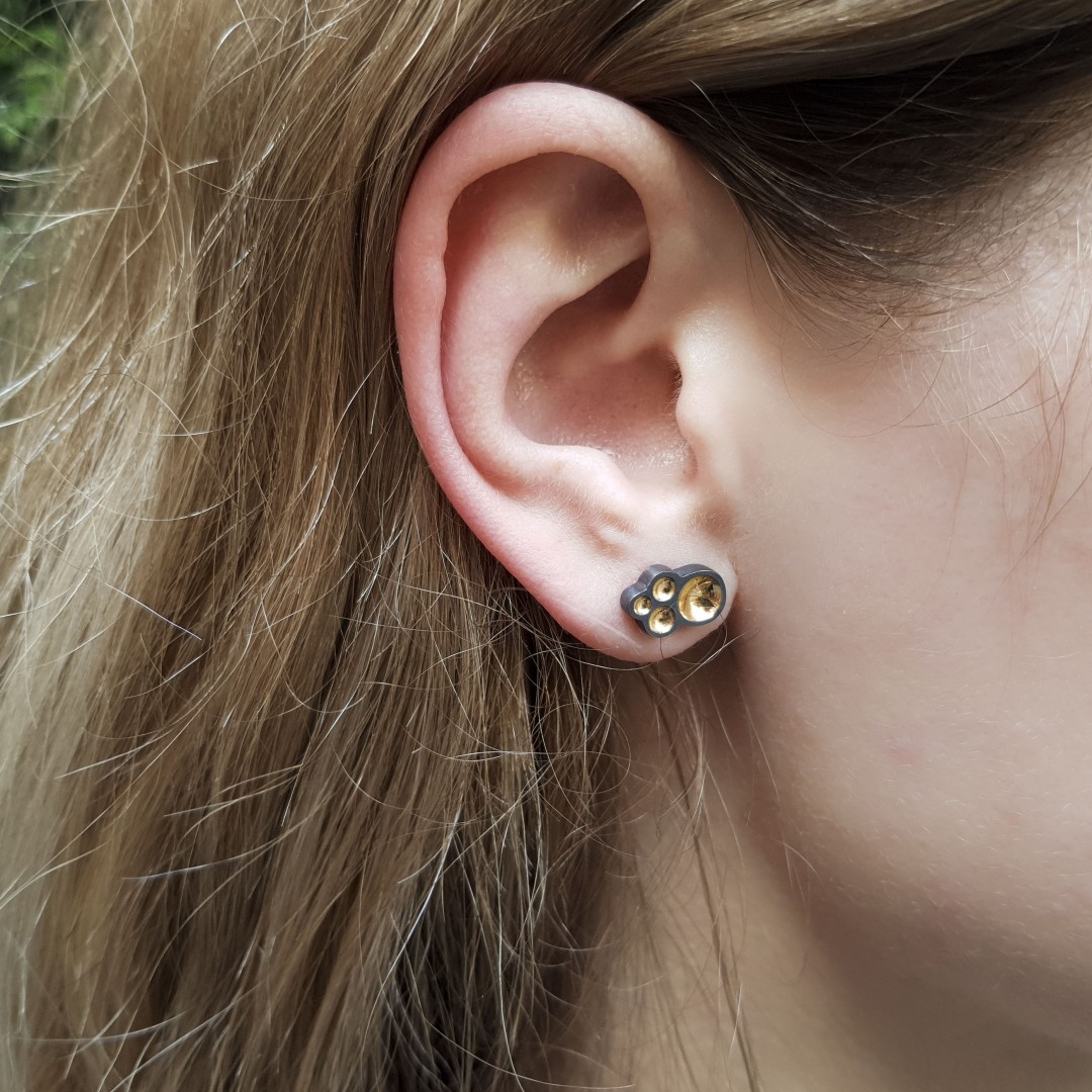 Abstraktaus dizaino sidabriniai auskarai, oksiduoti ir dengti grynu auksu.