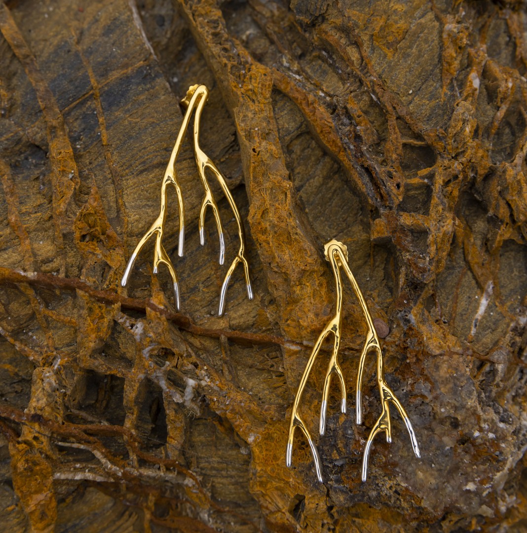 Auksuoto sidabro auskarai, tarsi po žeme besismelkiančios medžio šaknys. Kai norisi kažko išskirtinio sau arba nustebinti mylimą žmogų.