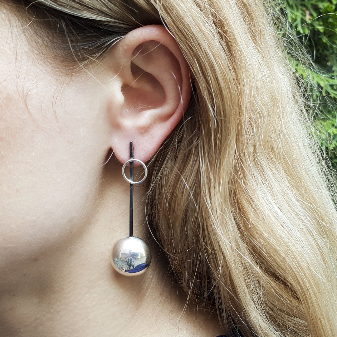 Modernaus dizaino ilgi sidabriniai auskarai.