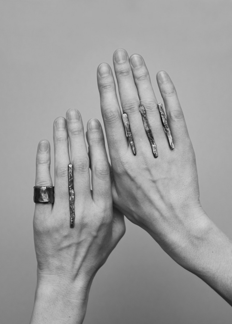 Faktūruoto matinio ir oksiduoto sidabro žiedas dviems pirštams.