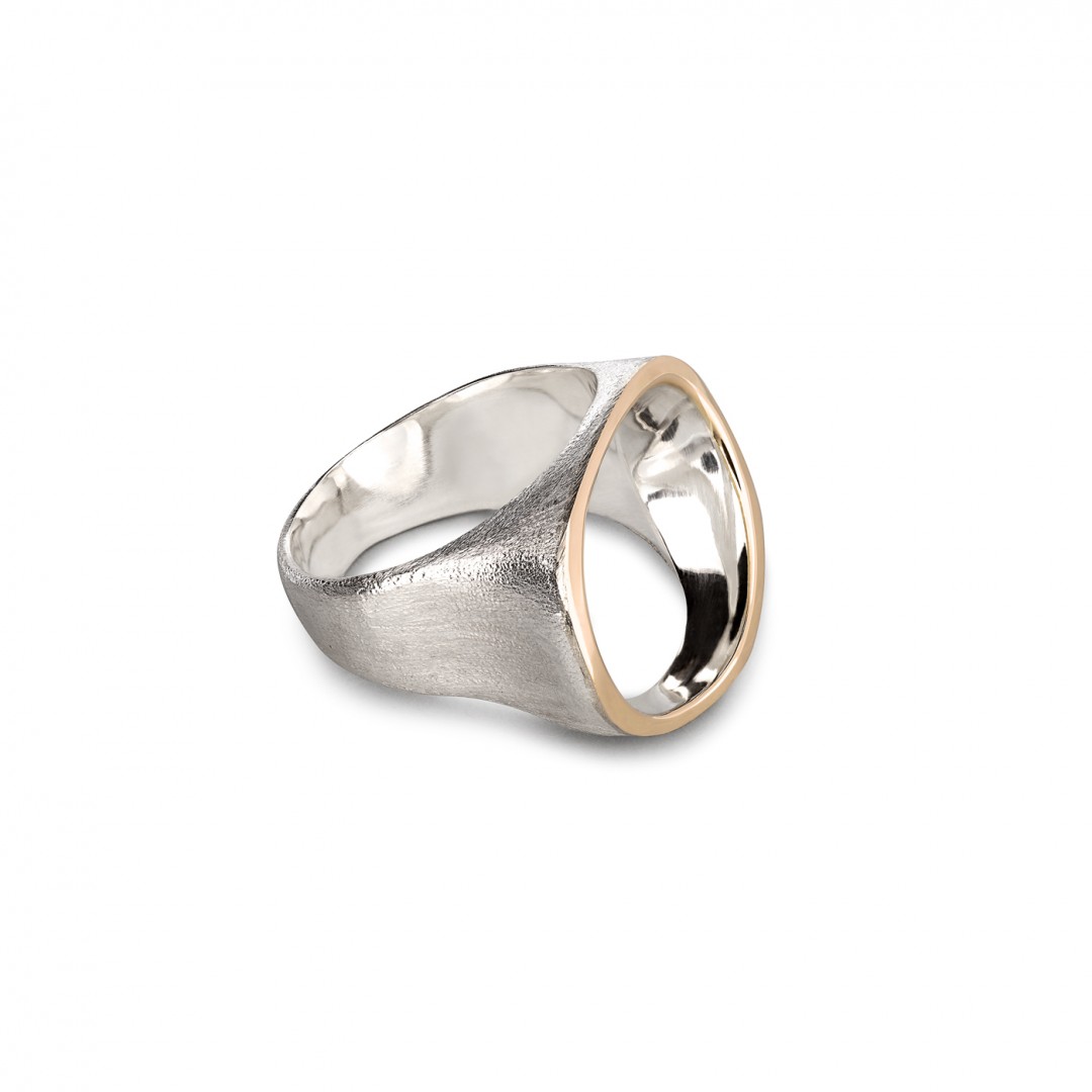 Faktūruoto matinio sidabro žiedas su blizgia poliruoto aukso detale.