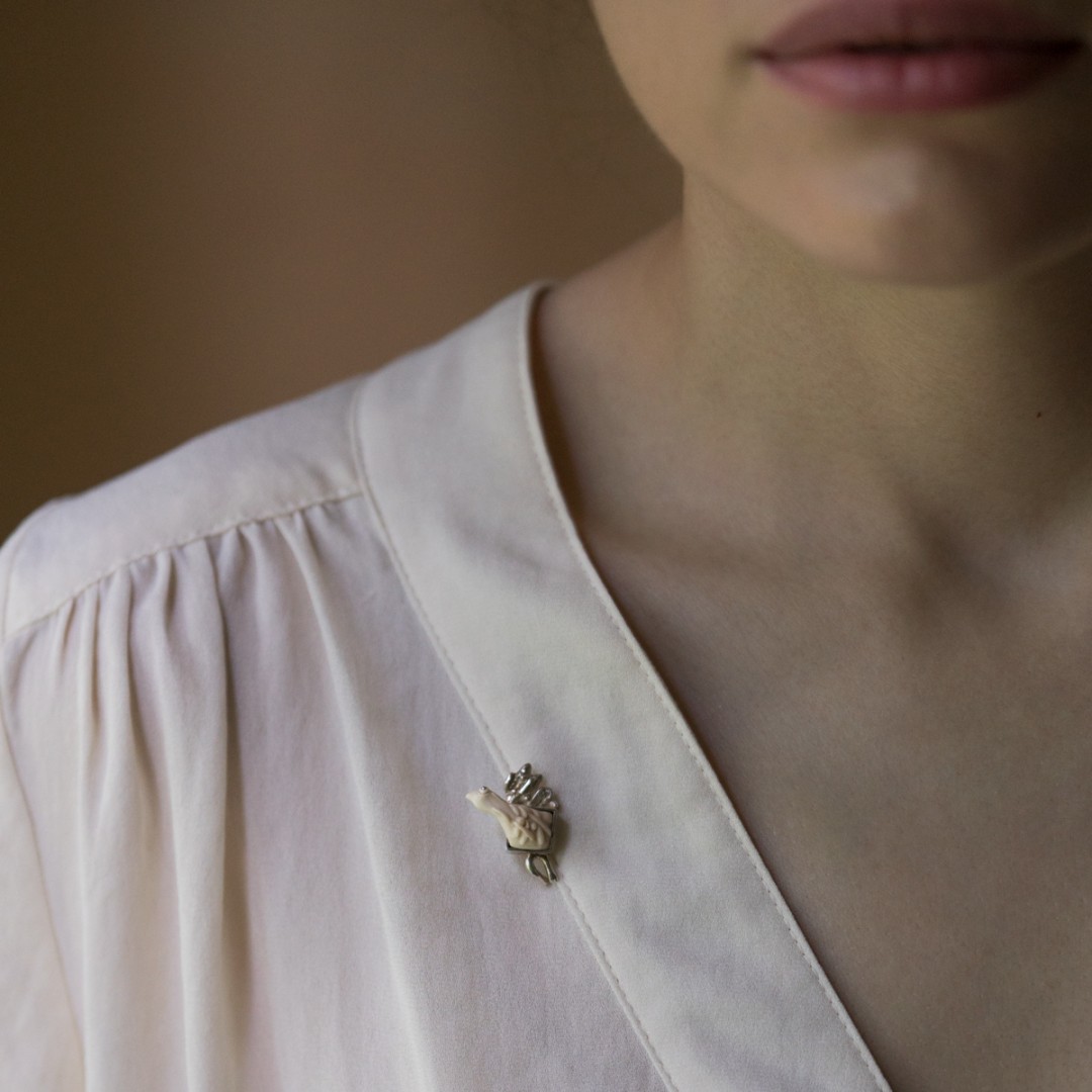 Urtės Balčaitės kuriamos rankų darbo sagės ir ženkliukai žavi kruopščiai apdirbtomis organinėmis medžiagomis: mamuto kaulu, karvės ragu, koralo inkrustacijomis ir šmaikščiais arba romantiškais animalistiniais motyvais.